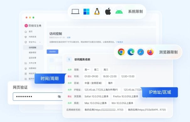不仅如此,贝锐花生壳还提供精细化访问权限控制、爆破防护等高级功能增值服务。它可以基于时间周期、IP 地址 / 区域、浏览器 / 系统版本等条件来判断是否允许访问,自动阻止未经授权的访问请求,再也不用担心私有服务暴露在公网。