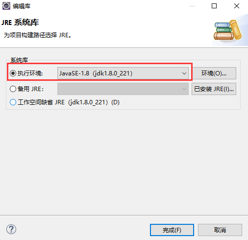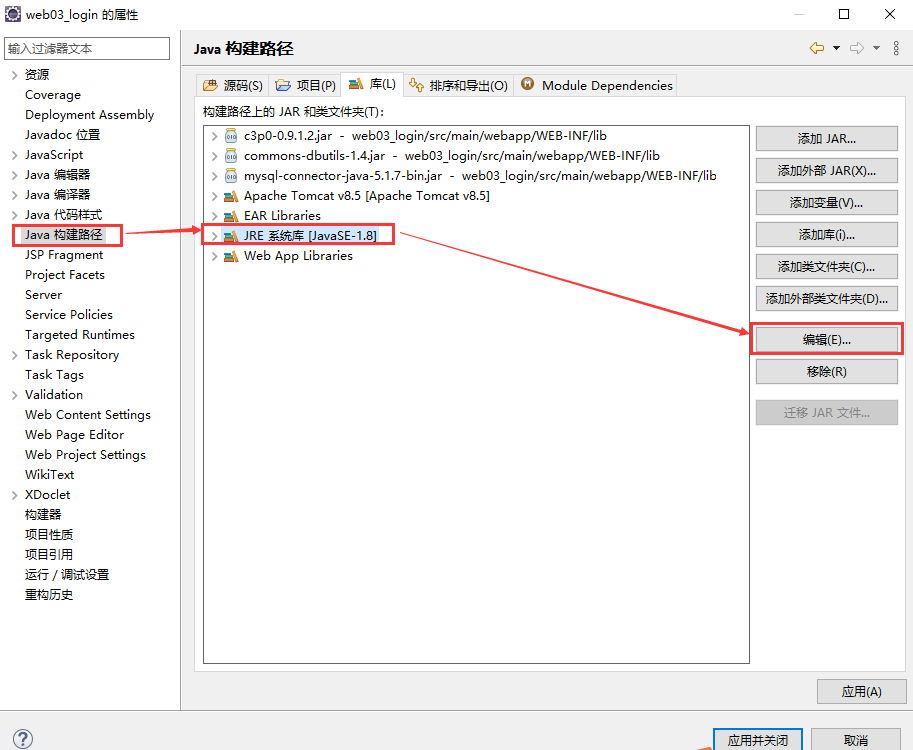 ①选择JRE系统库,点击编辑(如果没有JRE系统库,就直接点击“添加库”)