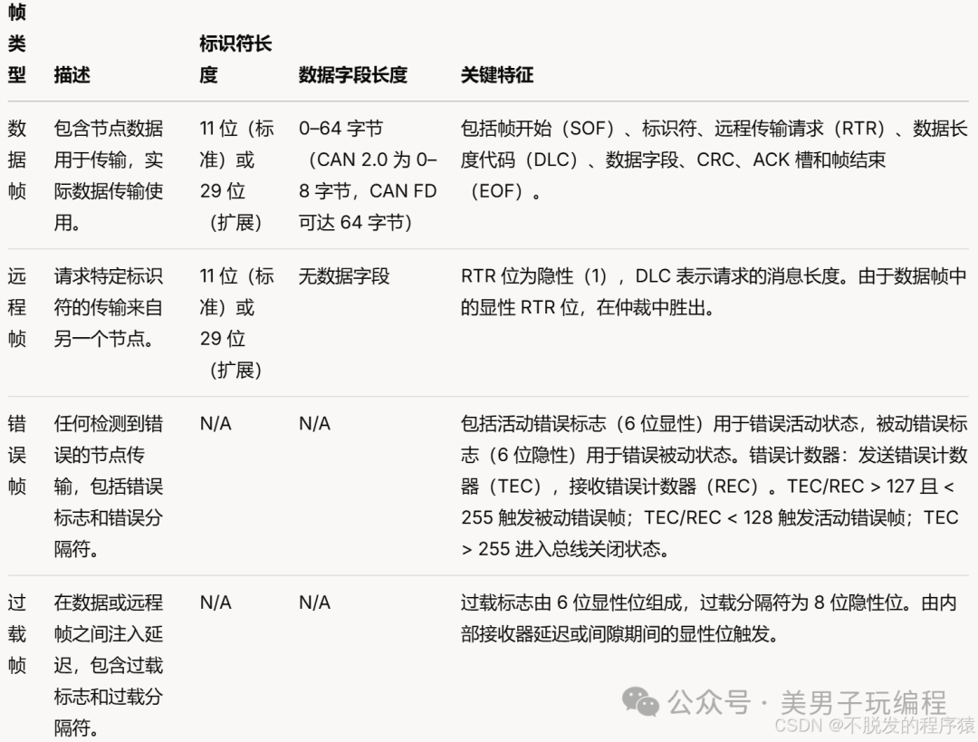 通过检查特定位和传输时机,可以准确识别帧是数据帧、远程帧、错误帧还是过载帧。此知识对于故障排除和优化基于 CAN 的系统至关重要。