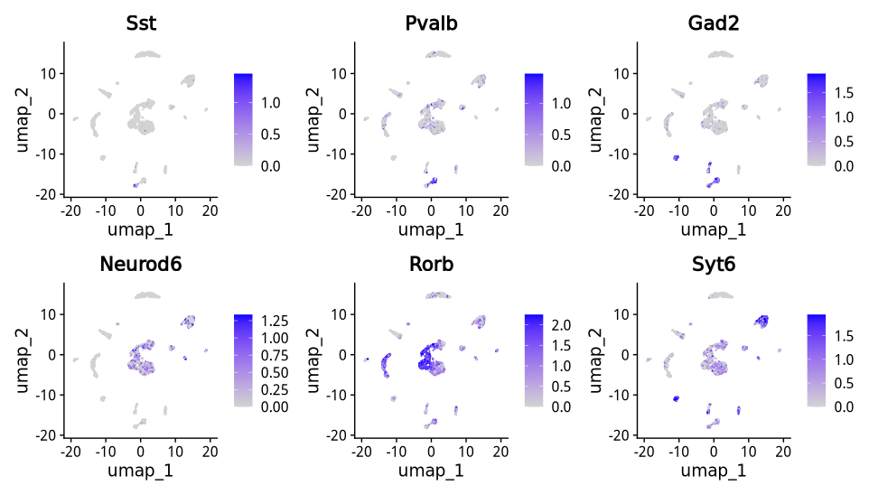 features = c('Sst','Pvalb',"Gad2","Neurod6","Rorb","Syt6"),