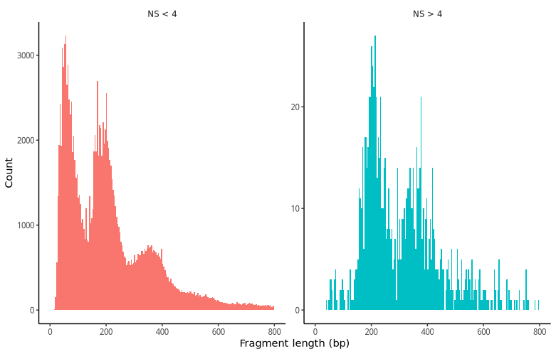 我们可以观察所有细胞的片段长度周期性,并根据核小体信号强度的高低对细胞进行分组。可以看到,单核小体/无核小体比例异常的细胞具有不同的条带模式。其余细胞表现出典型的成功ATAC-seq实验的模式。