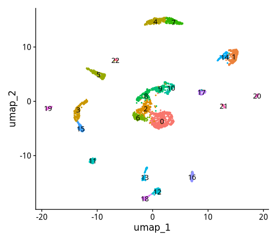 brain <- FindClusters(object = brain,algorithm = 3,resolution = 1.2,verbose = FALSE)