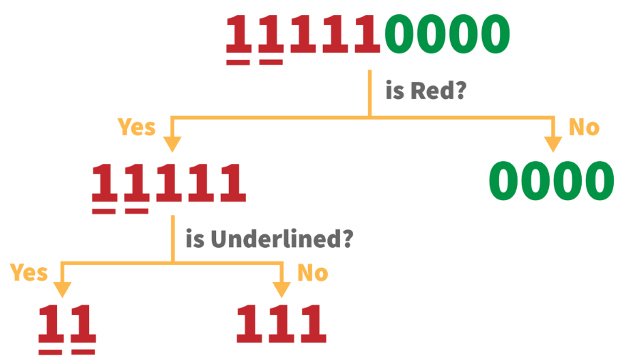 因此,我们首先从颜色开始,因为我们只对红色观察感兴趣,我们将红色和绿色字符分开。之后,“No”分支,即具有所有绿色字符的分支没有进一步扩展,因为我们只需要红色下划线字符。因此,我们扩展了“是”分支,并根据字符是否带有下划线的事实再次获得了“是”和“否”分支。