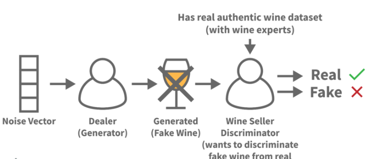 从上图中可以清楚地看出,噪声矢量正在进入生成器(经销商),他生成假酒,鉴别器必须区分假酒和真酒。这是一个生成对抗网络(GAN)。