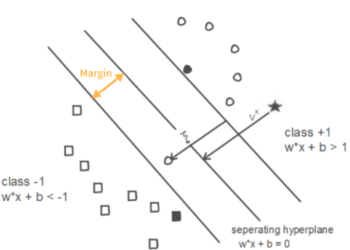 在上图中,我们可以看到细线标记了从分类器到最近数据点(变暗的数据点)的距离。这些称为支持向量。因此,我们可以将支持向量定义为最接近(最接近)超平面的数据点或向量。它们会影响超平面的位置。由于它们支持超平面,因此它们被称为支持向量。
