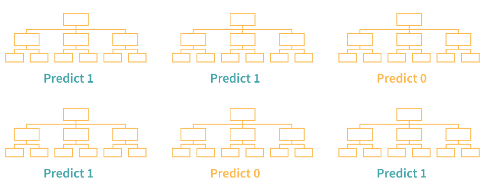 它由大量作为集合运行的决策树组成。基本上,森林中的每棵树都给出了一个类预测,而投票数最大的那棵树成为我们模型的预测。例如,在下面的示例中,4 个决策树预测 1,2 个预测 0。因此,将考虑预测 1。