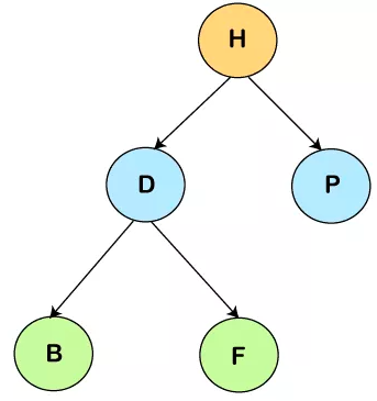 根据我们的规则,B 小于 D,这反过来又使其小于 H,因此它被放置在元素的左侧,键为“D”。这是因为在这种情况下,第一个元素被视为树的其余部分的根元素。
