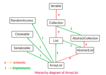 如上面的层次结构图所示,ArrayList 类实现了 List 接口并扩展了实现 List 接口的 AbstractList(抽象List)。