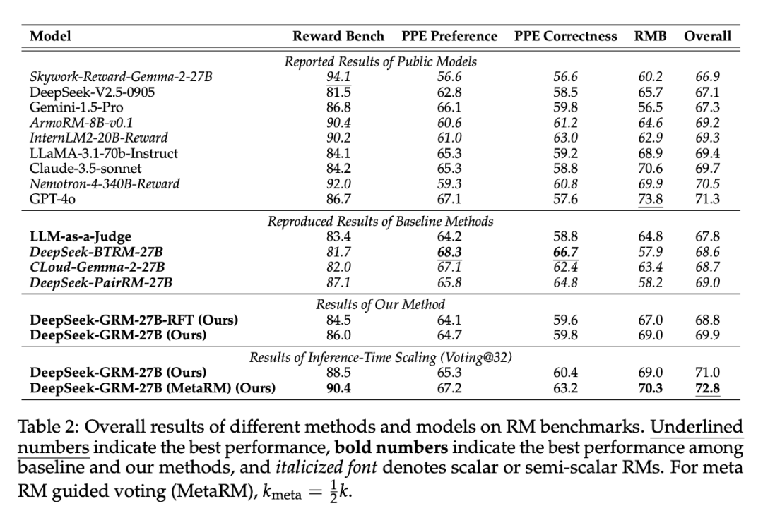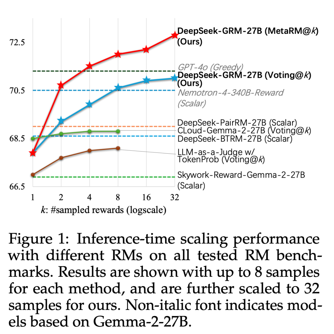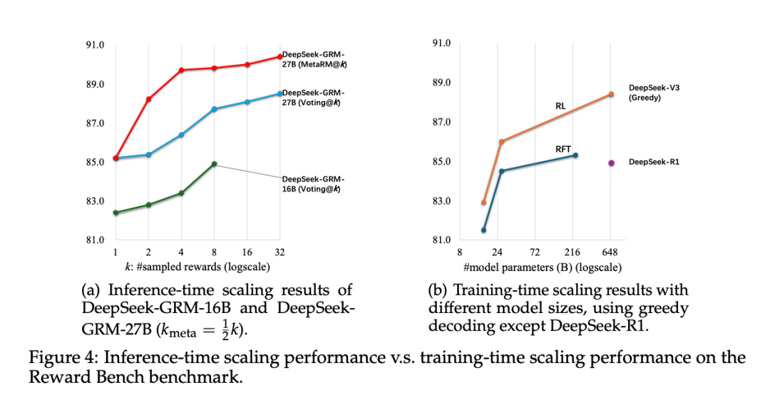 研究者们还进一步研究了 DeepSeek-GRM-27B 在推理阶段和训练阶段的扩展性能,通过在不同规模的 LLM 上进行后训练进行评估。所有模型均在 Reward Bench 上进行测试,结果如图 4 所示。
