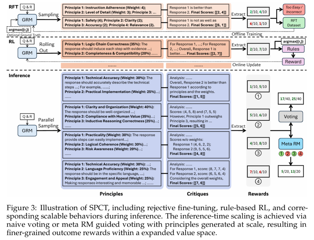 为同步优化 GRM 中的原则生成与批判生成,DeepSeek 提出 SPCT 框架,整合了拒绝式微调与基于规则的强化学习。拒绝式微调作为冷启动阶段。
