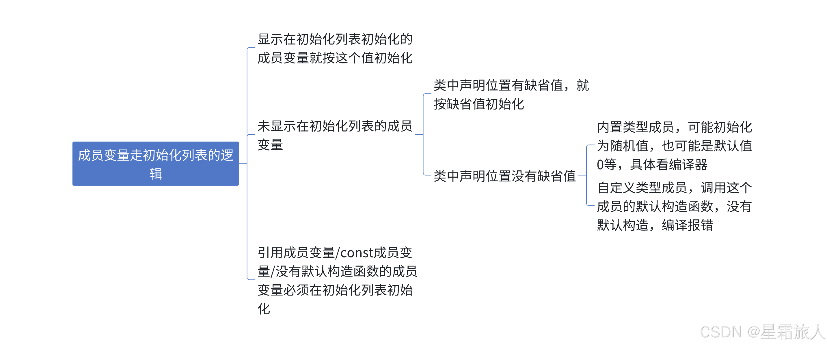 1. 在调用构造函数时,成员变量的初始化通常有两种方式:一种是在构造函数体内进行赋值,另一种是通过初始化列表进行赋值。 2. 初始化列表的使用方法如下:以冒号开头,随后是一个由逗号分隔的成员变量列表,每个成员变量后面紧跟一对圆括号,括号中包含该变量的初始值或初始化表达式。 3. 引用类型的成员变量,const修饰的成员变量,自定义类型的成员变量,必须放在初始化列表进行初始化,否则会编译报错。 4. C++11支持在成员变量声明时给缺省值,这个缺省值主要是给没有显示的在初始化列表初始化的成员使用的。 5. 尽量使用初始化列表,因为那些你不在初始化列表初始化的成员也会走初始化列表。 6. 初始化列表按照成员变量在类中声明先后顺序进行初始化,与成员在初始化列表出现的先后顺序无关。故建议声明顺序和初始化列表顺序保持一致。