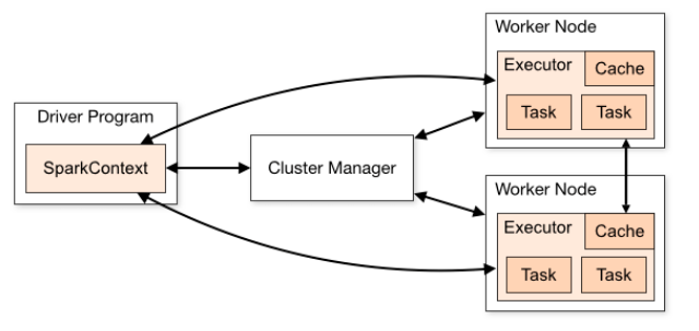 Apache Spark采用分层的主/从架构。Spark 驱动程序是控制集群管理器的主节点,它管理工作器(从属)节点并将数据结果传送到应用程序客户端。以下是Apache Spark架构