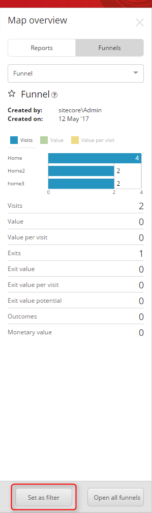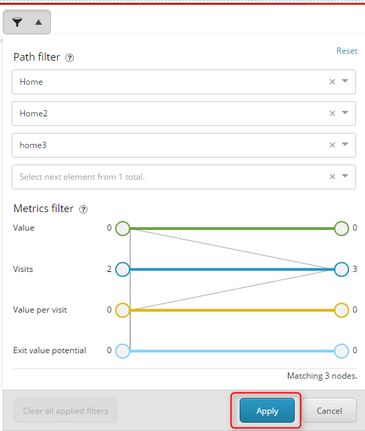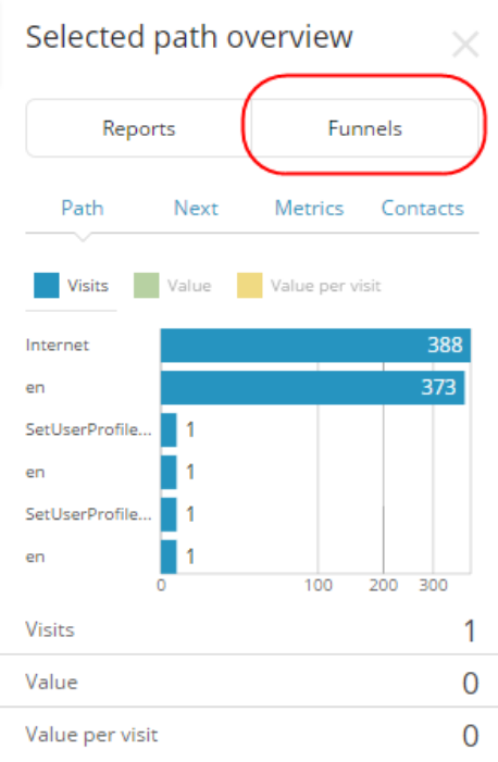 路径漏斗显示离开路径的联系人数以及退出的特定节点数。在路径漏斗中,您可以访问漏斗报告。这会显示通过此路径的所有联系体验的每次访问的价值,访问次数和价值。