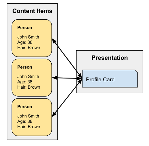 在上面的例子中,“Person”是内容。该内容可以以四种不同的方式显示。这可以实现内容重用。