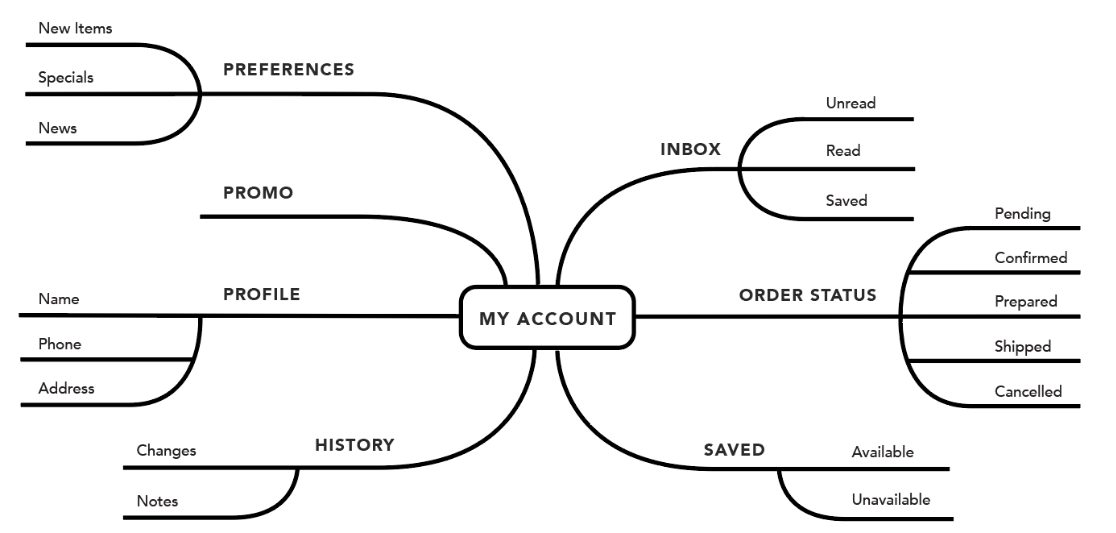 思维导图有助于组织与单个主题相关的信息集合,并以系统,有意义的方式构建它。在UX中,它们在进行分类构思工作时很有帮助,例如:
