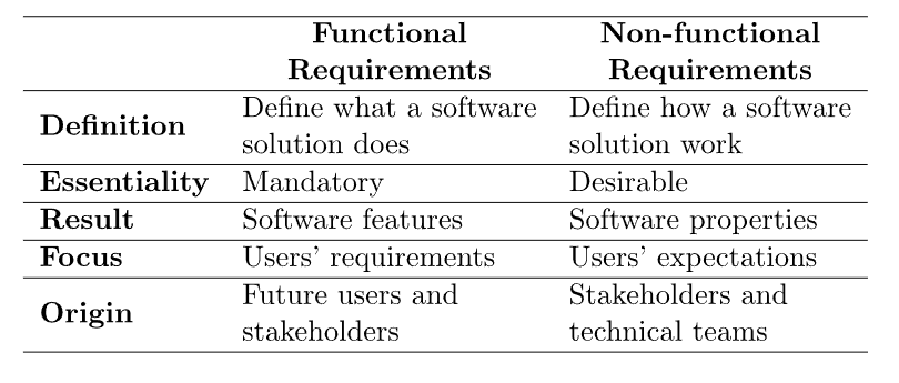 考虑到前面的定义,我们可以说定义功能需求是一个强制性的过程。另一方面,非功能性需求定义是可选的,但强烈建议使用以保证最终产品的质量。
