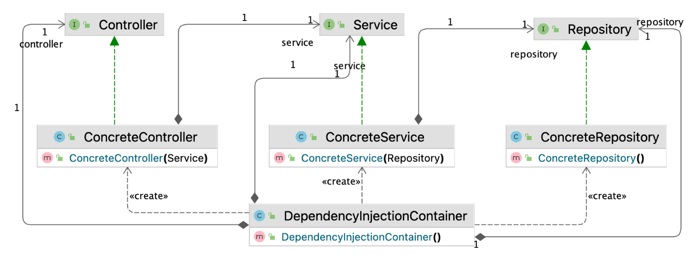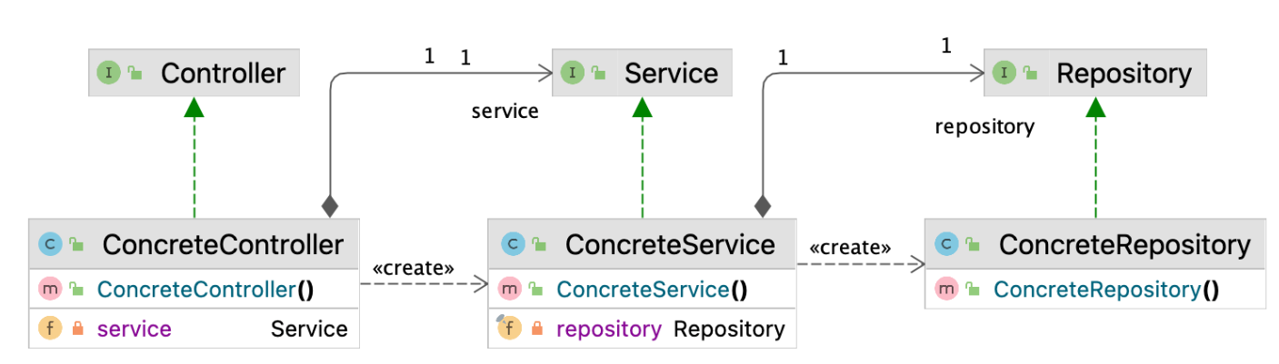 该图仅显示类之间的依赖关系。但是,它没有解释这些类是如何填充依赖项的。让我们使用一种朴素的方法,直接在每个类中实例化所需的依赖项: