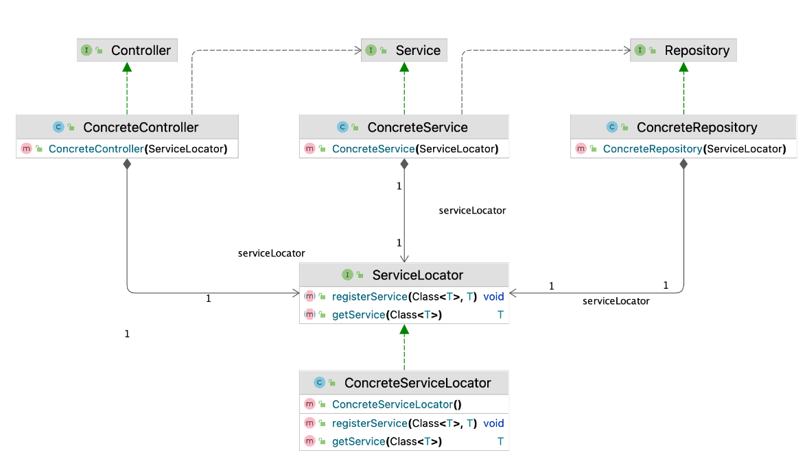 这些方法之间的主要区别之一是它们对引入的依赖项的透明度。依赖关系注入对类中使用的所有内容都是显式的,并且通过构造函数注入,它清楚地显示在类 API 中。虽然服务定位器将所有内容隐藏在内部,并且很难分辨哪些类依赖于哪个类,但唯一清楚的是,它们都依赖于服务定位器。可以使用隔离接口实现服务定位器,但这可能会导致接炸。尽管现代 IDE 可以显示依赖关系图并构建清晰的 UML 关系图,但 API 并不知道依赖关系。
