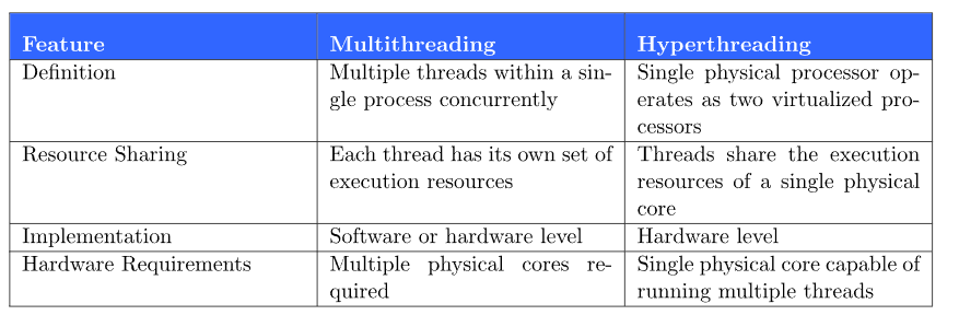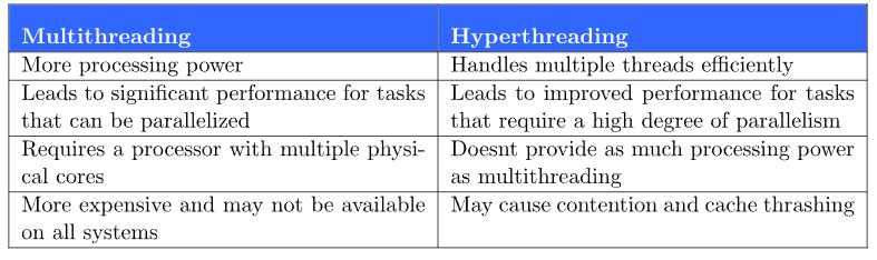 多线程可以更有效地处理可以并行化但需要更多处理能力的任务。另一方面,超线程提高了处理器处理多线程的效率,并提供了高水平的并行性,但不能提供与多线程一样多的处理能力。