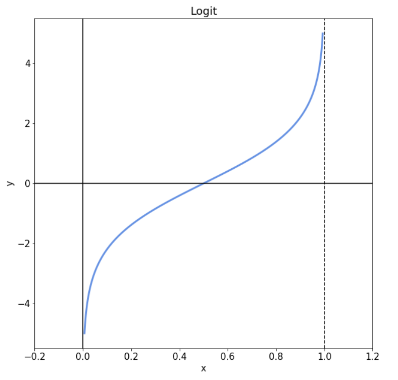 定义了逻辑函数之后,我们现在可以定义机器学习中通常用于分类任务的Logit模型,作为逻辑函数的逆。换言之,这意味着: