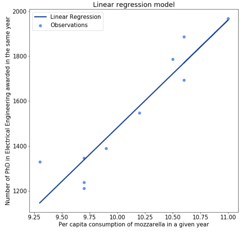 因此,牢记以下几点非常重要。对某些变量拥有良好的回归模型并不一定保证这两个变量具有因果关系。如果我们不牢记这一点,我们就有可能将因果关系分配给明显无关的现象: