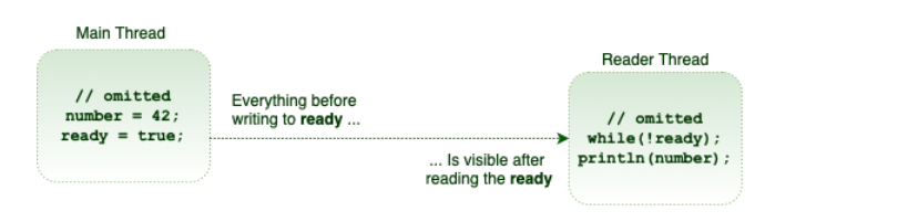 由于先于内存排序的强度,有时我们可以利用另一个volatile变量的可见性属性。例如,在我们的特定示例中,我们只需要将ready变量标记为volatile: