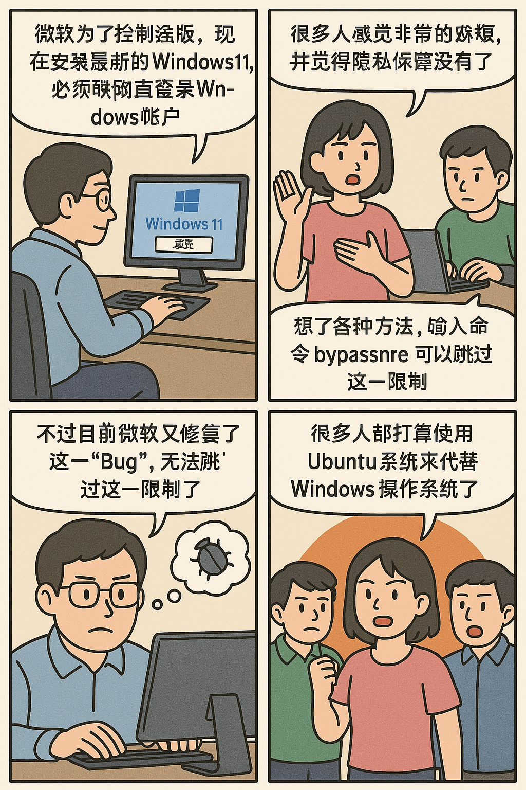 目前 ChatGPT 免费用户每天只能能生成四张图,想要更好的体验,就得升级到 plus 会员,期待国内的 AI 也能很快赶上来,最后放一张网络上别人用 ChatGPT 做的四格漫画,按照 AI 的这种发展速度,以后只需要创意,其他的都可以交给 AI 了。
