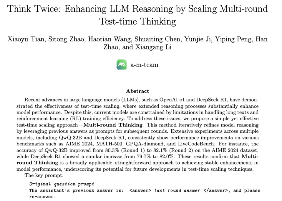 近日,由 a-m-team 团队提出的一项新研究提出了一个更简洁直观的思路:三思而后行(Think Twice)。它不依赖新的训练,不引入复杂机制,仅通过一种非常人类式的思维策略 ——“再想一轮”—— 在多个基准任务中带来显著性能提升。