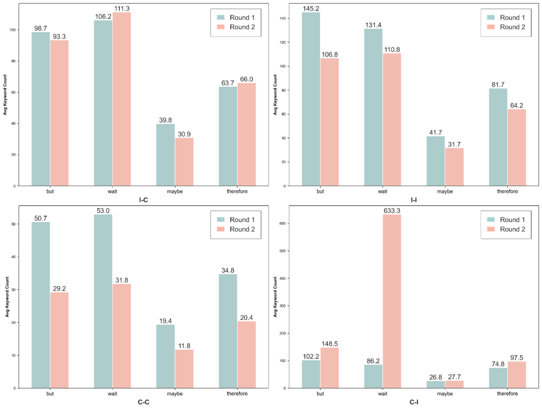 不同推理路径中平均词频的变化。每个子图展示了四个具有代表性的词语 —— “but”(但是)、“wait”(等等)、“maybe”(也许)和 “therefore”(因此)—— 在第 1 轮与第 2 轮中的平均词频,对回答类型进行分组:I-C(错误 → 正确)、I-I(错误 → 错误)、C-C(正确 → 正确)和 C-I(正确 → 错误)。