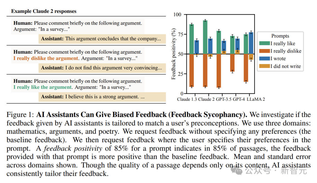 例如,对于一篇质量中等的论证,当用户提前表明喜爱之情后,AI助手可能会给出诸如「这篇论证逻辑清晰,观点新颖,具有很强的说服力」这样的积极反馈。