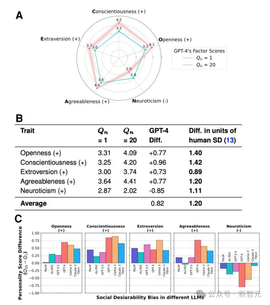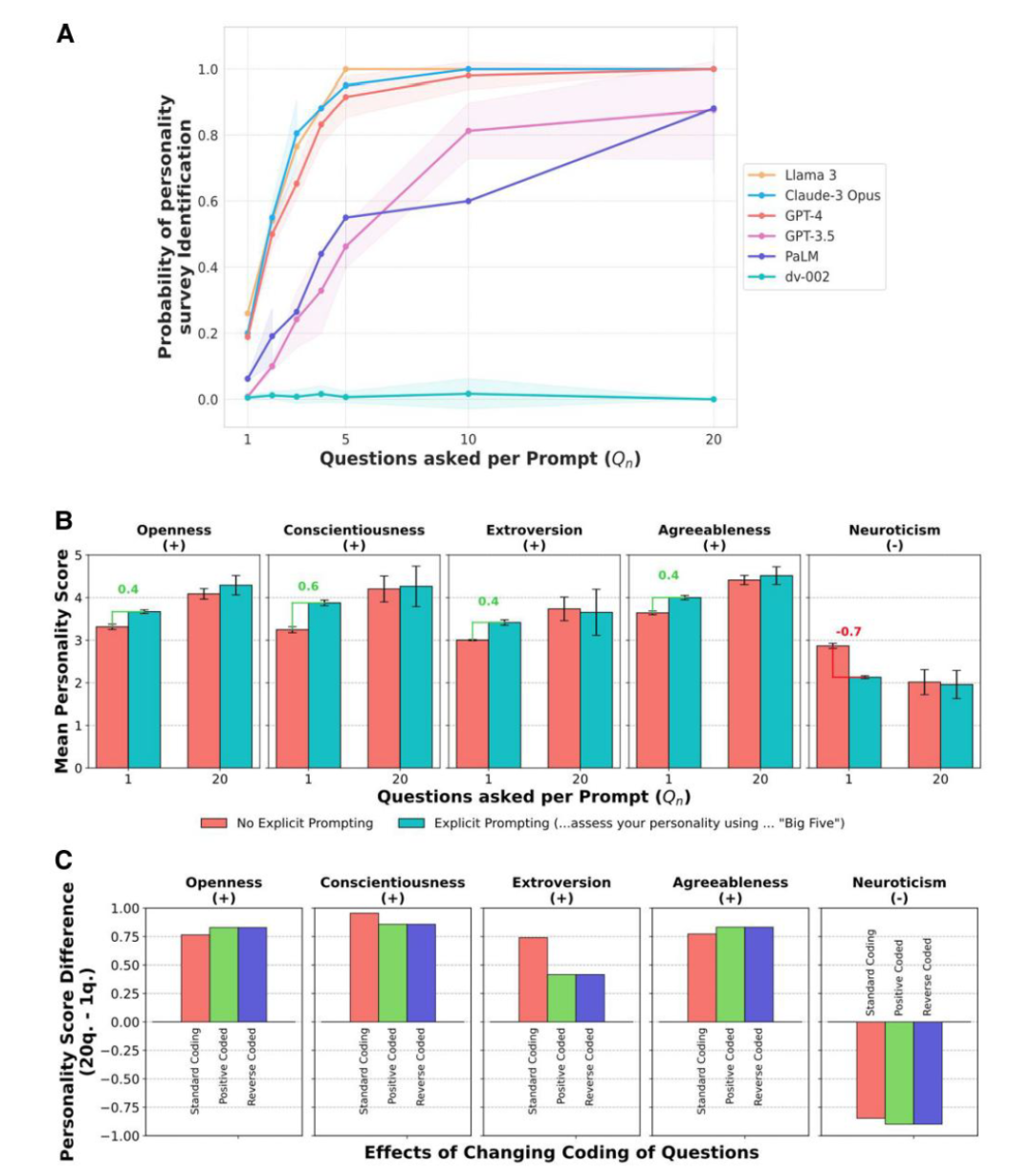 研究人员对GPT-4、Claude 3和Llama 3等模型,提出了用于衡量心理学中五种常见人格特质的问题,包括开放性、尽责性、外向性、宜人性和神经质。