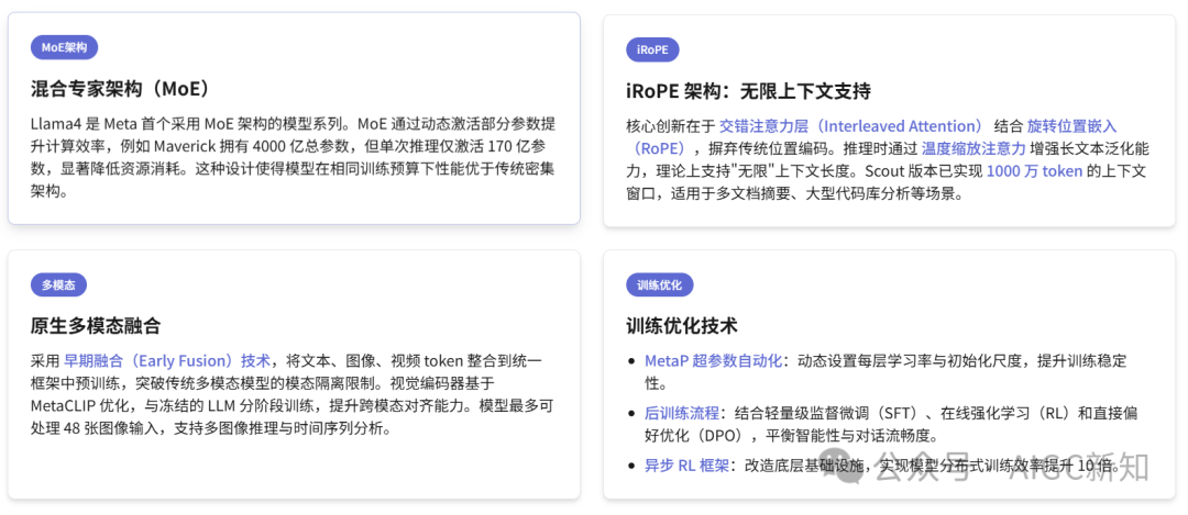 此外,Llama4系列还整合了文本、图像和视频的统一框架,使其具备原生多模态能力。