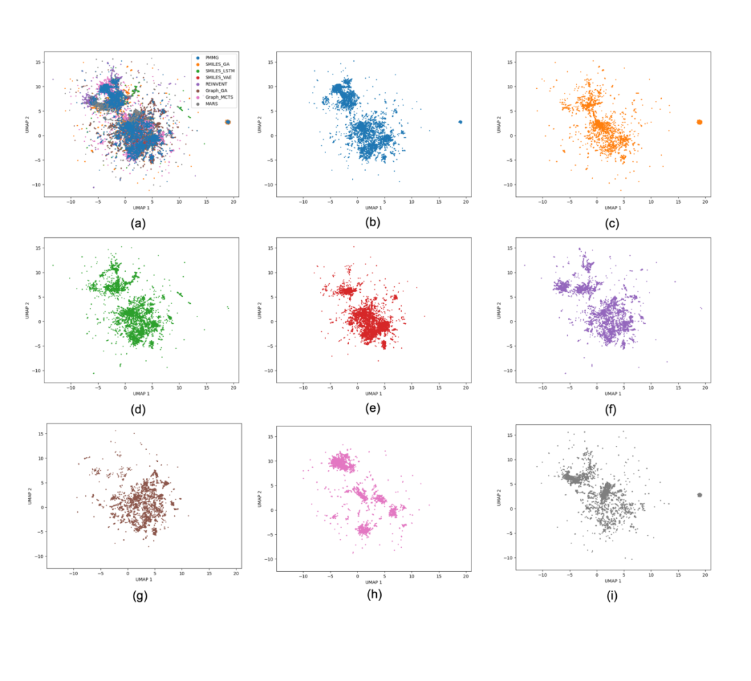 为了可视化分子结构的多样性,作者采用了UMAP对生成分子进行分析。如图3所示,不同模型生成的分子分布具有显著相似性。PMMG模型生成的分子能够覆盖其他模型所探索的大部分化学空间,这与表1中呈现的多样性(Div)结果一致。