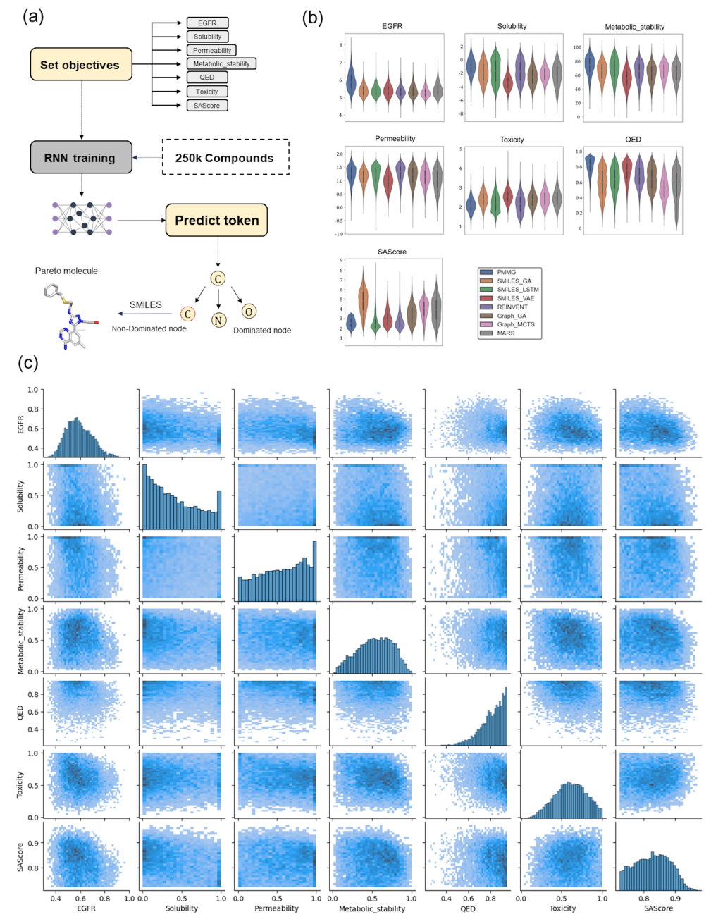 图2. 单一目标优化结果。a) 实验中PMMG的工作流程。b) 每种方法在七个目标上的分子分布琴状图。c) 每对目标之间的散点图。
