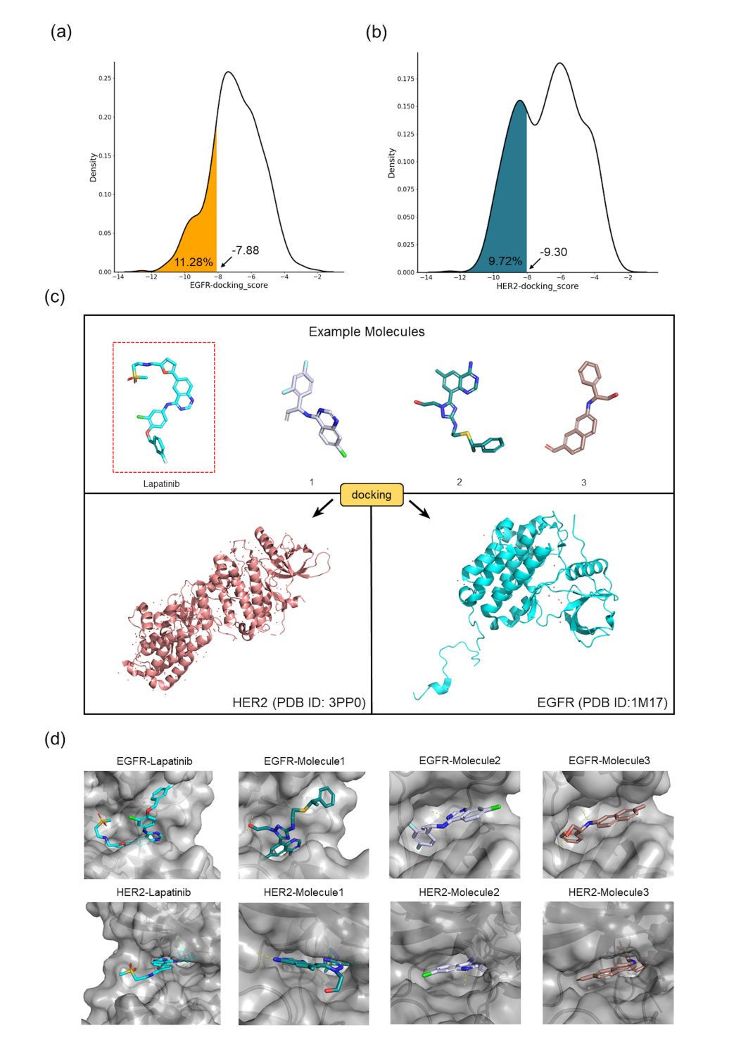 图5. 分子对接结果。a) 分子在EGFR上的对接得分分布。b)分子在HER2上的对接得分分布。c) 示例分子的对接示意。d) 分子1、2、3和Lapatinib与EGFR和HER2的对接构象。