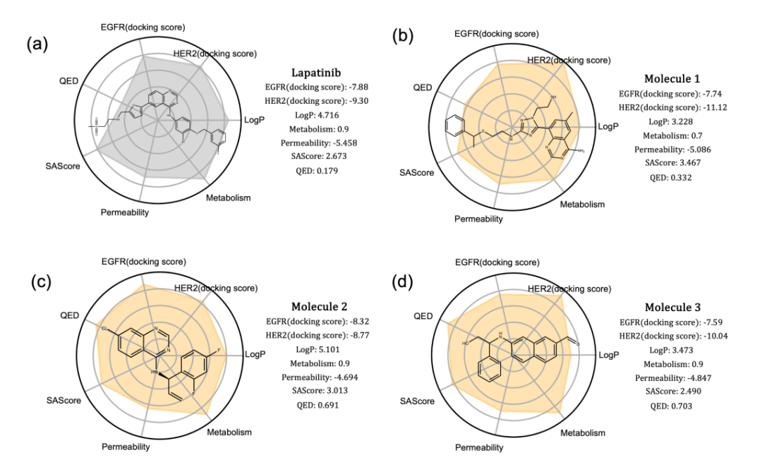 图4展示了部分代表性分子,这些分子在EGFR和HER2的对接评分上与Lapatinib表现相当,甚至在某些维度上表现更优;在LogP、膜渗透性、代谢稳定性、可合成性与类药性等方面,也展现出优异的预测性能。这些结果不仅验证了PMMG在多目标优化任务中的强大能力,也凸显了其在双靶点药物早期发现中的应用潜力。