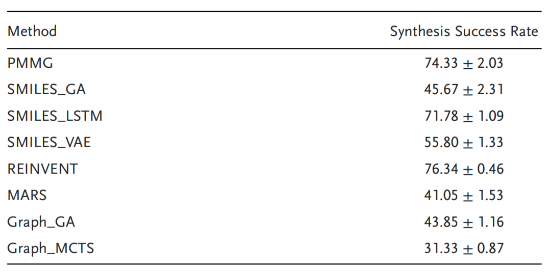 此外,分子的可合成性是评估生成模型实际应用性的重要因素。除了评估目标分子的合成相关属性(如QED和SAScore)外,作者还使用了反合成工具AiZynthFinder进行了更深入的分析。如表2所示,PMMG生成的分子平均可合成性达到了74.33%,进一步突显了PMMG在实际场景中的应用潜力。