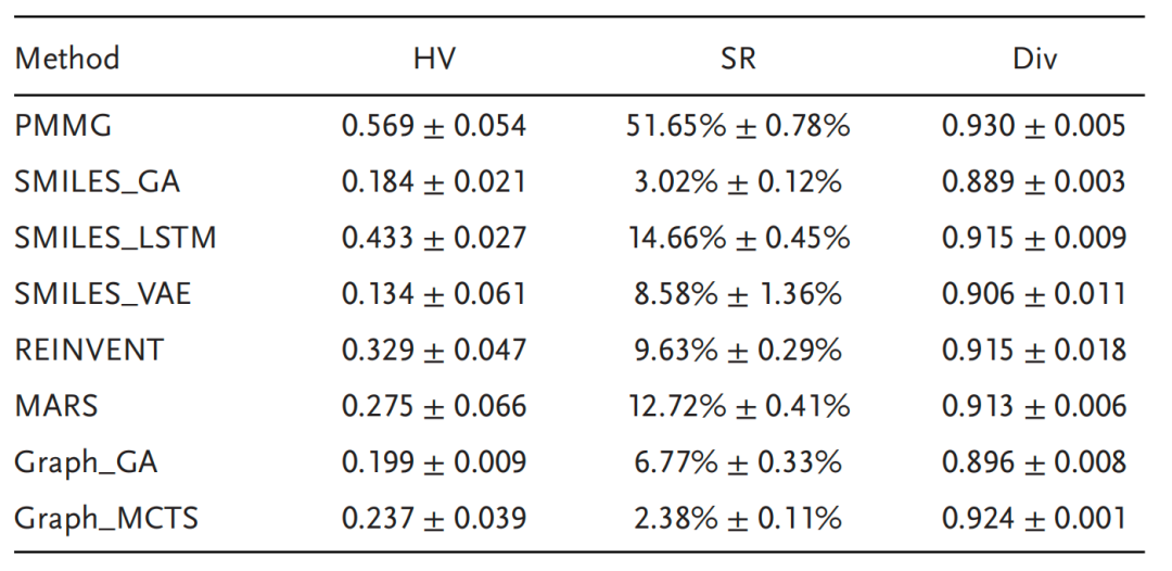 为了评估PMMG的性能,实验选取了7种SOTA方法与PMMG进行比较,并将其分为两大类:一类为基于SMILES表示的方法,包括基于遗传算法的SMILES-GA、基于强化学习的REINVENT等。另一类为基于图表示的方法,包括基于图神经网络与马尔可夫链蒙特卡洛采样的MARS、图遗传算法Graph-GA等。