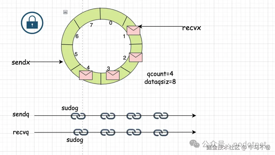 ① 环形队列buf (buf、dataqsize、sendx、recvx 圈定了一个有固定长度,由读/写指针控制队列数据的环形队列)。