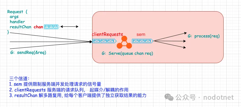 <-c // Wait for sort to finish; discard sent value.下面演示了:服务端使用有缓冲信道限制并发请求