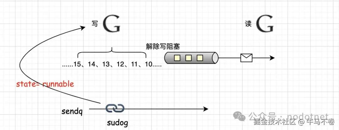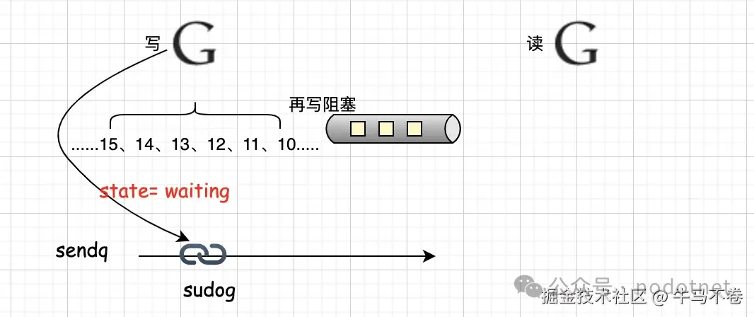 ① 基于写goroutine创建sudog[2], 并将其放进sendq队列中;