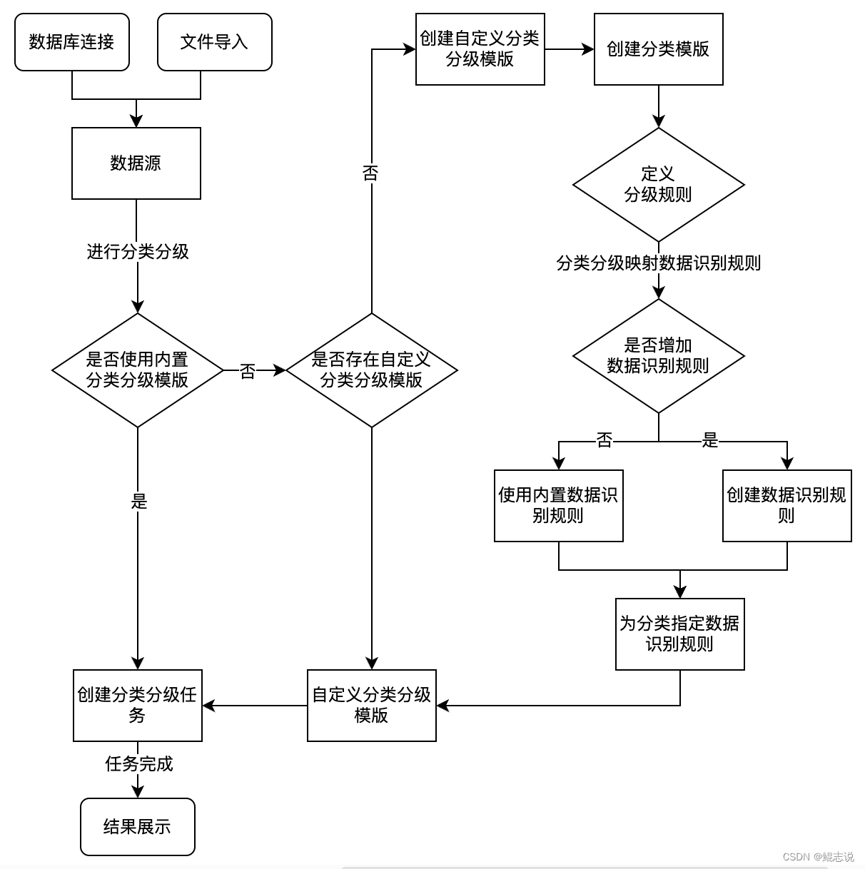 核心流程图可看出,主要分为:数据源模块、分类分级模版模块和任务执行模块