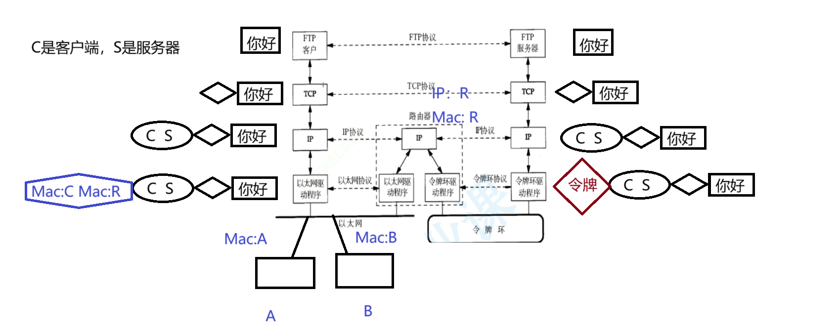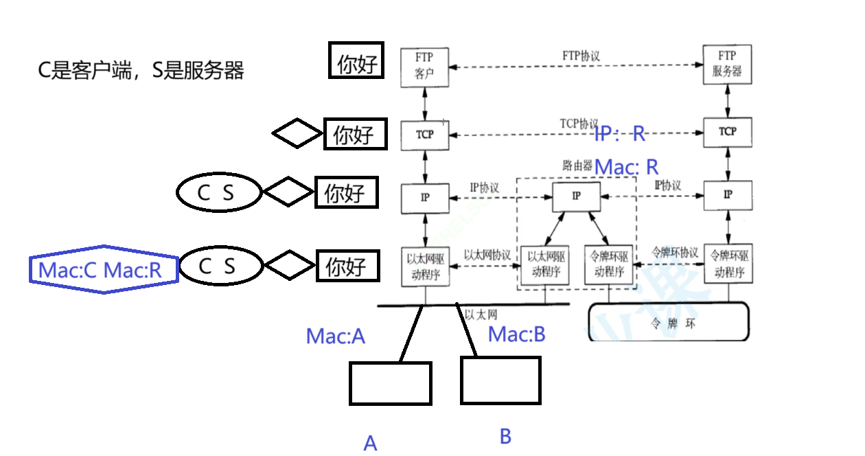 在上面的图中,我们发消息,层层封装之后到了数据链路层,然后有了Mac的发送地址,之后这个报文到了以太网中,发现其他不是Mac R的地址就不会进入,看到了Mac是R就进入了路由器,然后询问路由器S在哪里,路由器刚好知道S的IP地址,直接就能将C通过令牌环网送到S当中;拿到了令牌环的令牌,也就是添加了令牌环的报头(也是令牌环的协议)。
