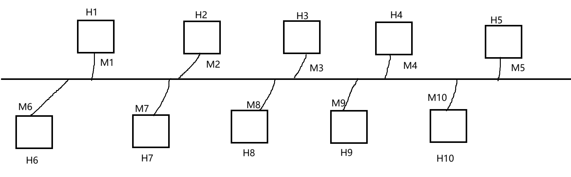假设H1发送给H10一个信息,其他人能收到吗?答案是不会的,因为发送的时候里面有M10的地址,其他主机一看不是自己的地址就不会接受这个报文。 这就是局域网通信原理。 那么如果H1发给H10,H5发给H6,这两个发送同时进行,消息就会碰撞,然后谁也收不到。 所以一个消息在发送的时候,其他消息就会等待,延迟一段时间发送,避免消息碰撞。(所以需要检测局域网被没被使用,一直检测)