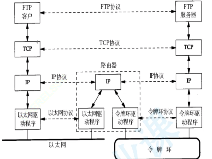 跨网段的主机的数据传输. 数据从一台计算机到另一台计算机传输过程中要经过一个或多个路由器. 这是一张示意图: