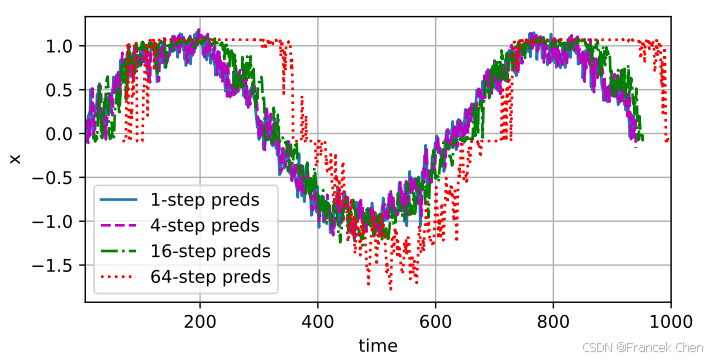 (n_train + tau),其结果看起来仍然是可信的。然而有一个小问题:如果数据观察序列的时间步只到