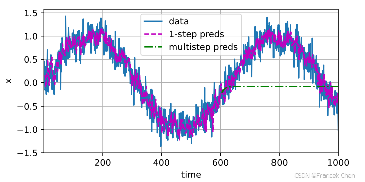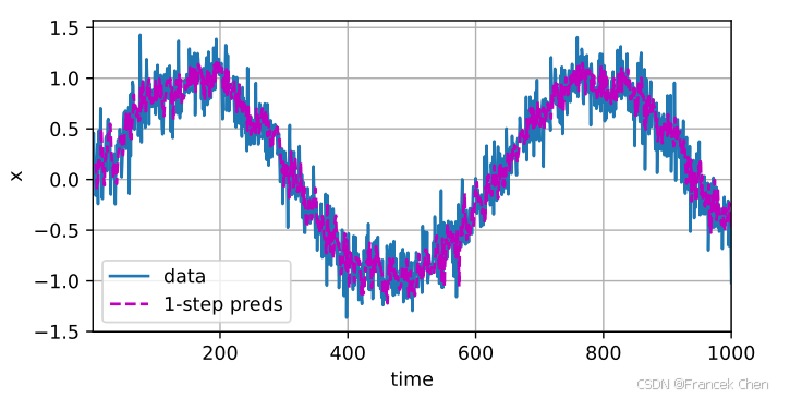 'x', legend=['data', '1-step preds'], xlim=[1, 1000],