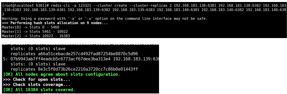 redis-cli -a xxx --cluster create --cluster-replicas 2 192.168.183.138:6381 192.168.183.138:6382 192.168.183.138:6383 192.168.183.139:6381 192.168.183.139:6382 192.168.183.139:6383 192.168.183.140:6381 192.168.183.140:6382 192.168.183.140:6383