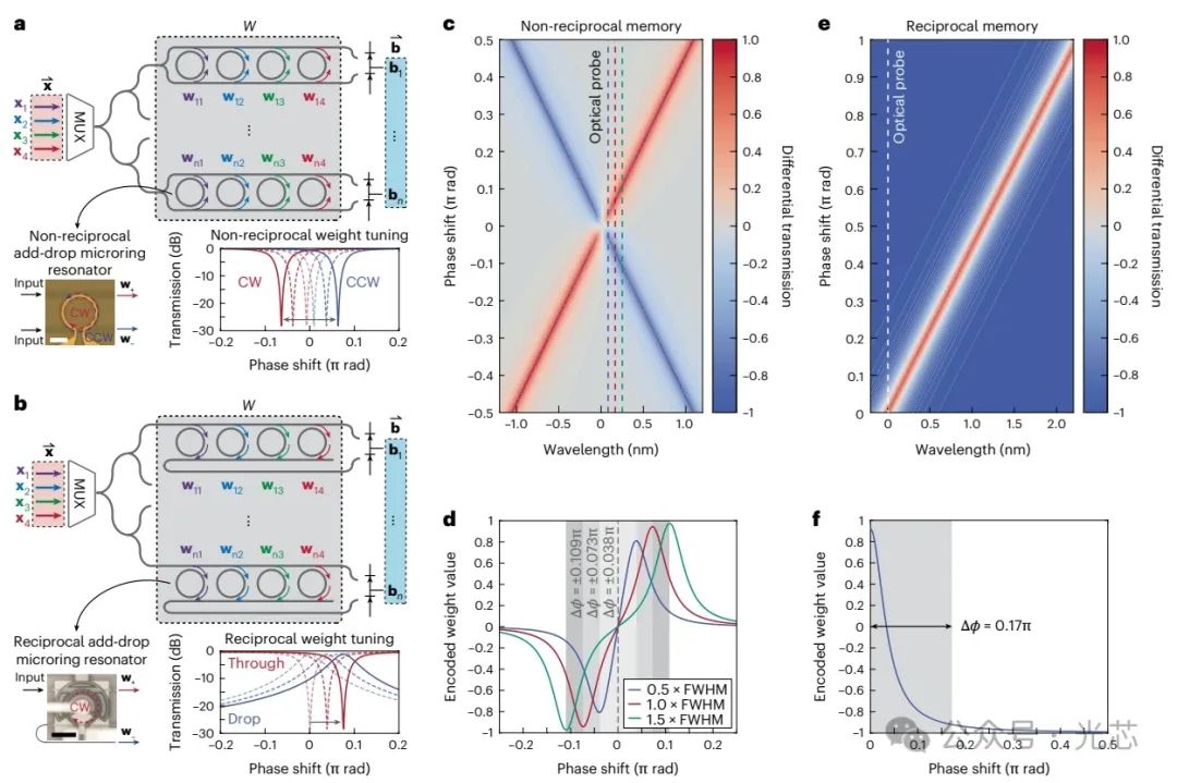 比如这篇NP,就是利用前面提到的原理,结合微环的双向非互易传输的特性,实现了一个光计算架构上的创新。在磁场作用的情况下,一个方向传输的光信号谐振波长发生蓝移,另一个方向则产生相等偏移量的红移(不考虑热效应的话)。双向移动的相移的效率自然比传统互易型的相移要更好了。