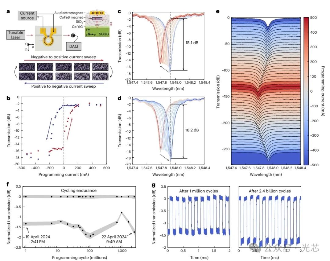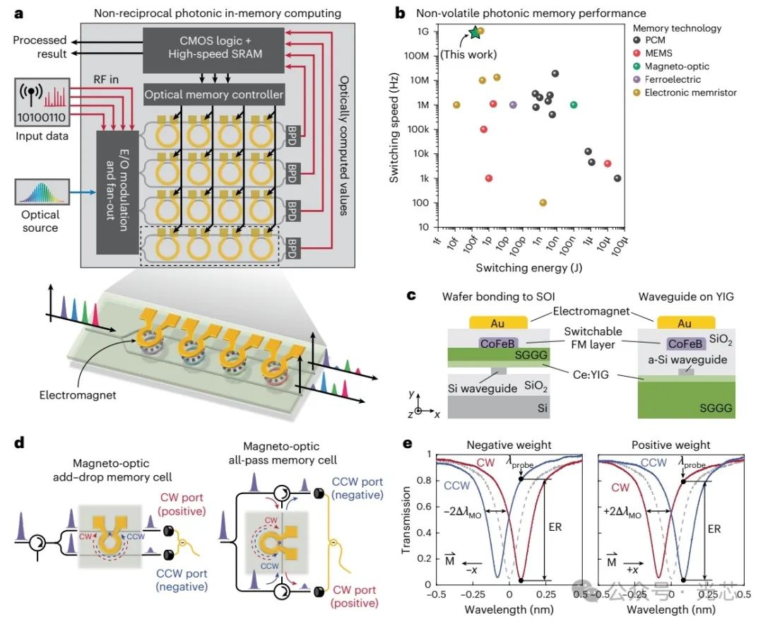 UCSB和东京工业大学的团队在NP上报道了利用非互易磁光效应材料与集成光波导器件的异质集成,实现高速(1GHz)、高效(143fJ/bit)、高可靠性(24亿次循环)的光子存内计算架构。